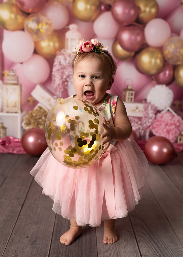 While I don’t supply floating balloons, I do have some balloons that can be inflated and placed on the floor. If you want to include balloons, please choose simple round balloons — directional balloons can be distracting during the shoot and may take attention away from capturing your little one’s natural smiles.